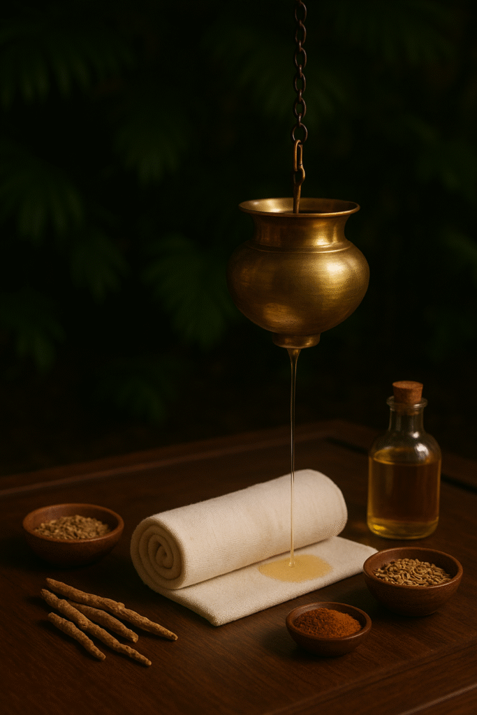 A relaxing and refreshing full body massage with medicated herbal oils to take care of physical, mental, emotional well being of the person while balancing the doshas. After the procedure the person is directed to take a herbal steam bath followed by a hot shower. As pitcher becomes resistant and firm by smearing oil, the skin and body become strong , bright and resistant to pain and exertion; the obstructing Vata dosha is calmed down by applying the oil.
