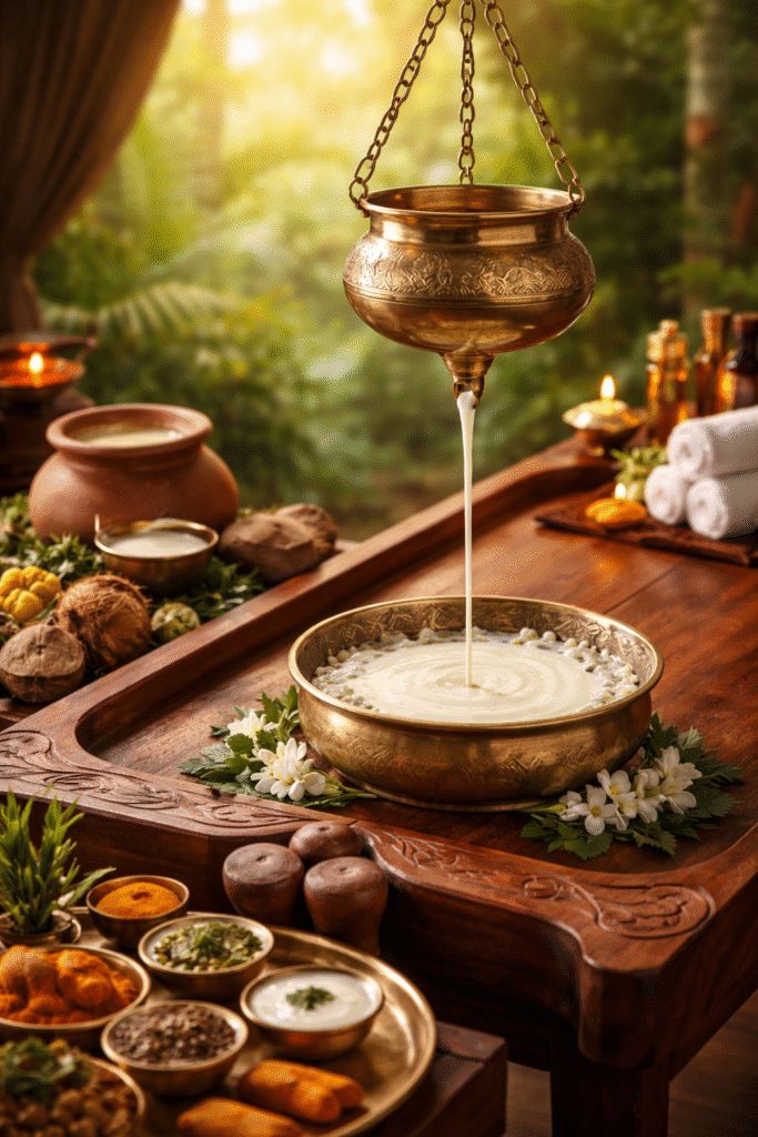 The word takra means buttermilk, dhara with medicated butter milk is called as takradhara..This ayurvedic treatment method which involves continuous flow of medicated butter milk to the centre of forehead continuously for up to an hour. It indicated in diseases like psoriasis, mental worries, Insomnia, Chronic headaches, migraine